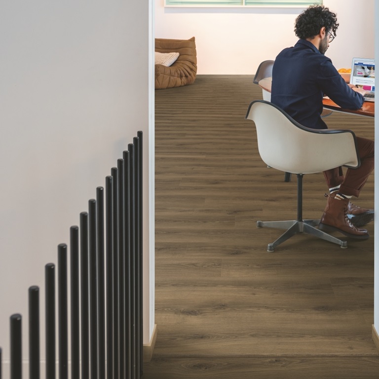 Ламинат Quick Step (Квик степ) Дуб теплый коричневый — надежное напольное покрытие для квартиры и коммерческих помещений с умеренной нагрузкой. Темно-коричневый цвет с теплым подтоном создает уютную атмосферу, а однополосный рисунок и четырехсторонняя фаска формируют четкую геометрию пола, напоминающую массивную доску.